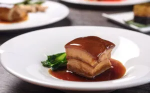 「寧式東坡肉」為飯店特色招牌菜,媒體評比常勝軍,每個月滷製的東坡肉就高達4000斤,每月平均外帶高達500份,月銷售萬份以上的人氣宴會菜;精選上等豬五花肉與醬油、冰糖、蔥、辣椒一同入鍋慢滷三小時,豐腴軟嫩的五花肉吸收滷汁精華入口即化,滋味不凡。