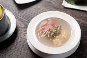 杭州特色名菜「西湖蓴菜羹」典故可追溯至晉朝,由蓴菜、火腿絲、雞絲與高湯煨製而成,鮮美滋味不在話下,烹飪時講究湯清與味鮮,薄薄一層勾芡映襯出火腿的紅、蓴菜的綠以及雞絲的白,色、香、味俱全。