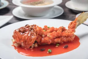 主廚選用體型較小的白口魚來表現江蘇十大經典名菜「糖醋松鼠魚」,將魚身去骨、剖花、酥炸呈松鼠狀,再淋上酸甜可口的糖醋醬,表皮香酥魚肉鮮嫩,小巧又精緻。