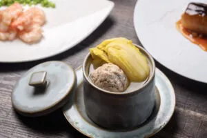 有別於濃郁的「紅燒」,主廚以南方口味呈現「清爽」,以肥瘦比例3:7的新鮮豬絞肉經拍打,加入洋地瓜丁揉合成型,起鍋煮水不沸騰,輕柔的將獅子頭放入鍋中煮至定型,再以高湯小火燉煮入味,清澈的湯汁匯聚雞肉的鮮與白菜的甜,耗時燉煮的獅子頭口感軟嫩,肉汁鮮美。
