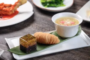 以精緻的手工港點、甜湯與水果為饗宴增添完美。口感酥脆、內餡扎實的「蘿蔔絲酥餅」嘗的到鮮甜蘿蔔絲,層次堆疊、口感香酥,「桂花紅豆糕」晶瑩剔透的桂花凍散發淡雅花香,甜而不膩的紅豆內餡嘗起來綿密又化口,「酒釀甜湯圓」甜酒釀的香氣散發迷人風味,搭配軟糯的湯圓一同品嘗,暖心又暖胃。