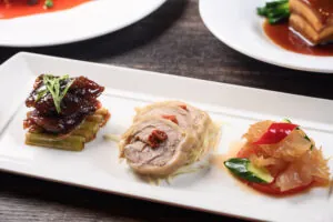 雅緻的拼盤匯聚蘇式燻魚、花雕醉雞以及麻香海蜇三種馨香滋味。「蘇式燻魚」以蔥段、醬油慢火㸆煨,魚肉吸收醬汁精華口口醇厚鮮香,「花雕醉雞」冰鎮入味的雞腿肉,散發紹興酒與中藥材的清香,風味迷人,「麻香海蜇」口感爽脆的海蜇嘗起來麻香開胃,令人欲罷不能。