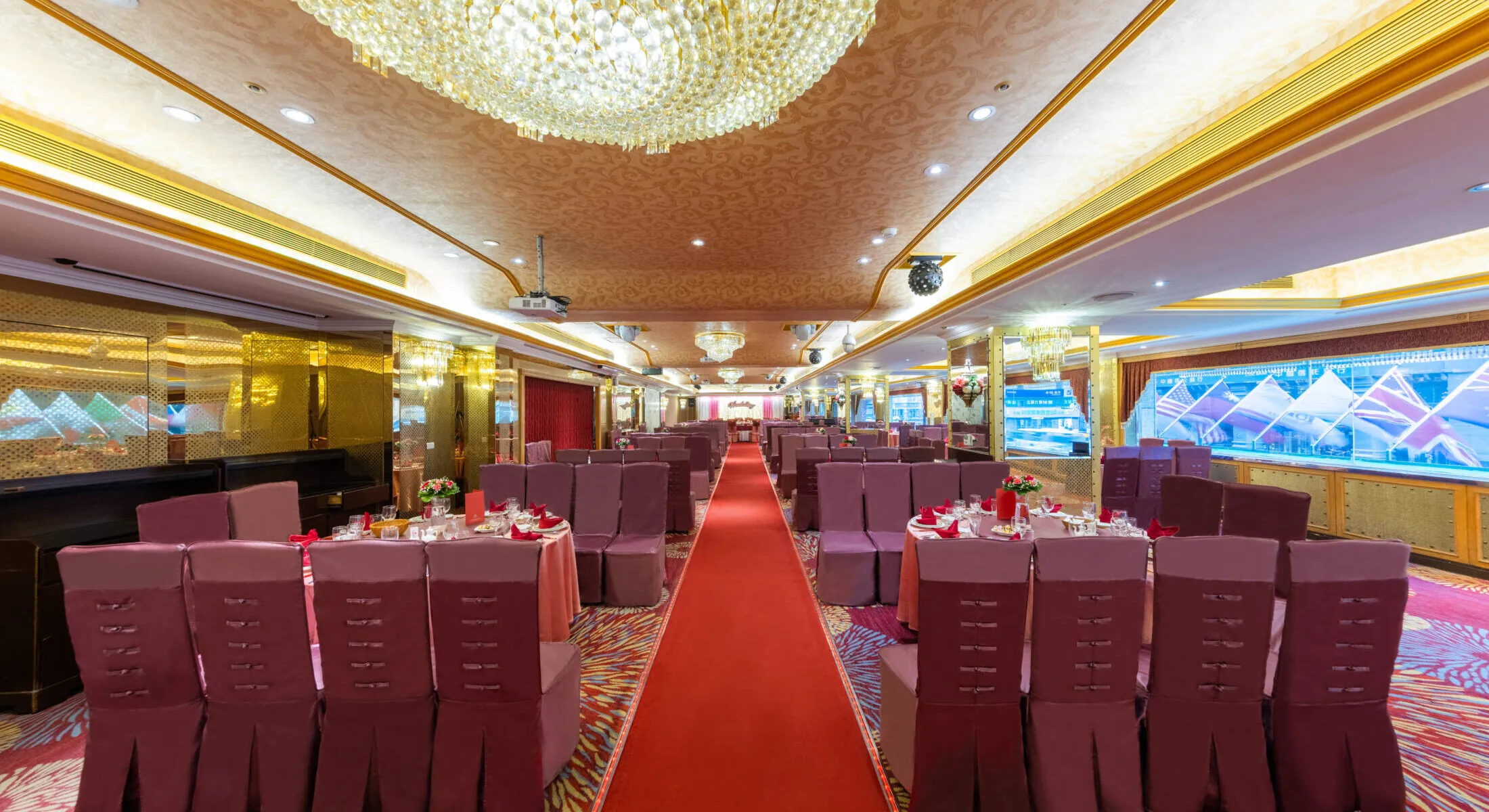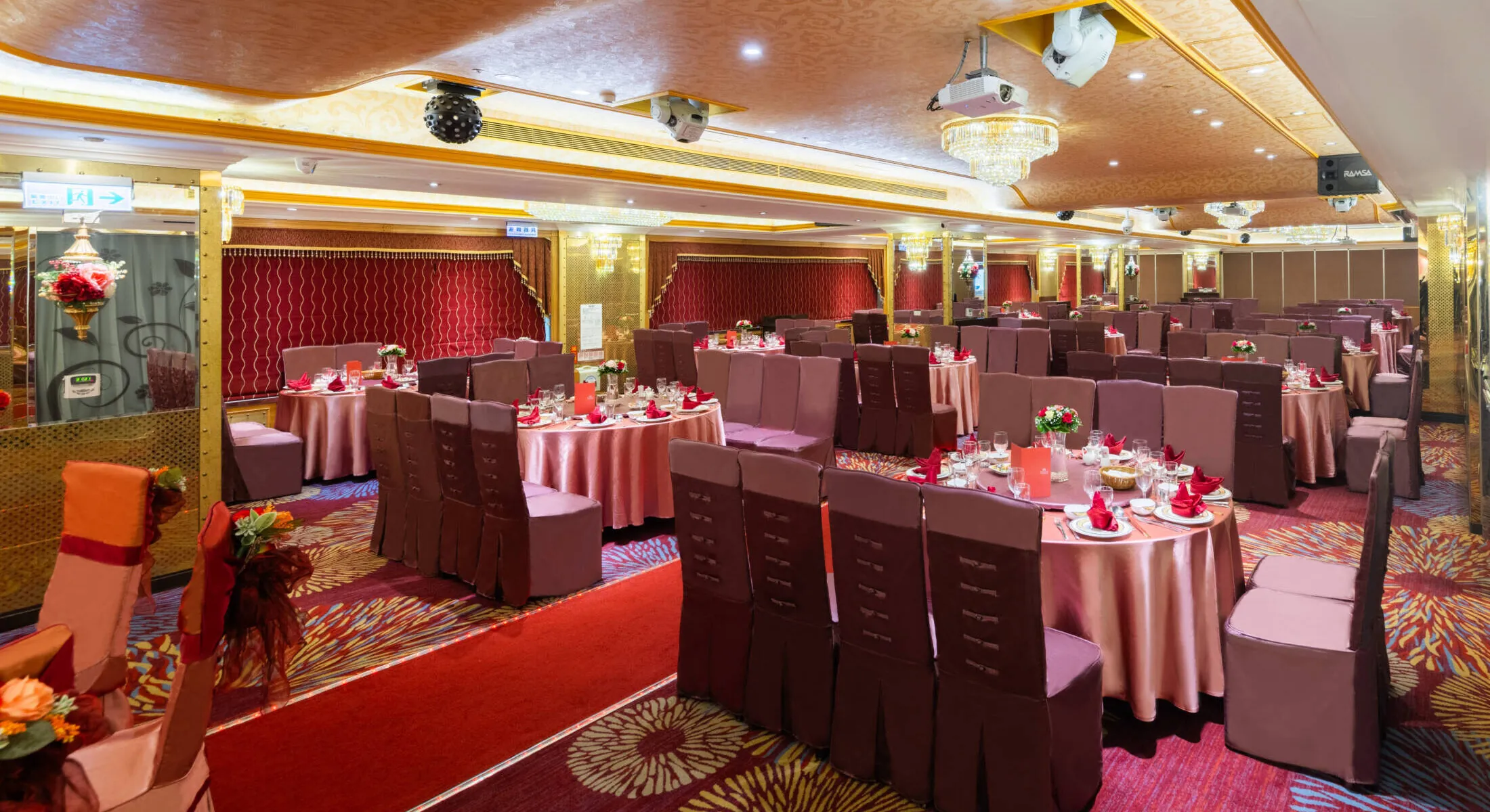 エレガントな宴会スペース。80名までの中型の会議や宴席に最適です。会場を仕切りグループに分けてご利用いただくなど、ご要望に合わせて調整いたします。また、4部屋に仕切り貸し切りとし、ビジネスランチとしてもお使いいただけます。